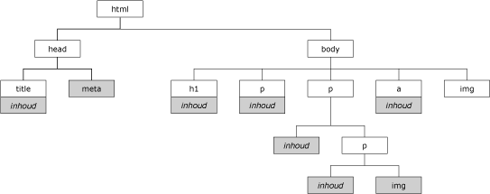 De DOM als boom structuur. De grijze vlakken zijn alles wat tussen de tag staat de inhoud dus aangegeven met het woord content. Als een andere dan content grijs is weergegeven betekend dit dat het een open tag is.
