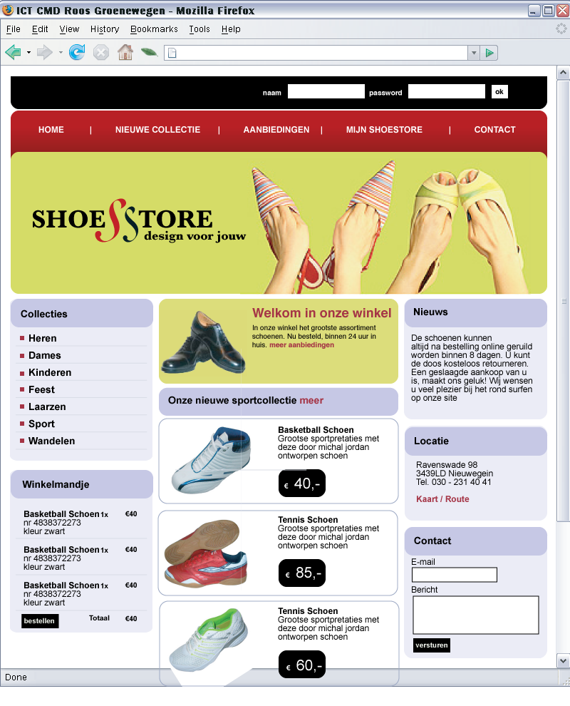 - Kolom 1 bevat een menu en de koppen zijn gemaakt met CSS, hieronder een winkelmandje