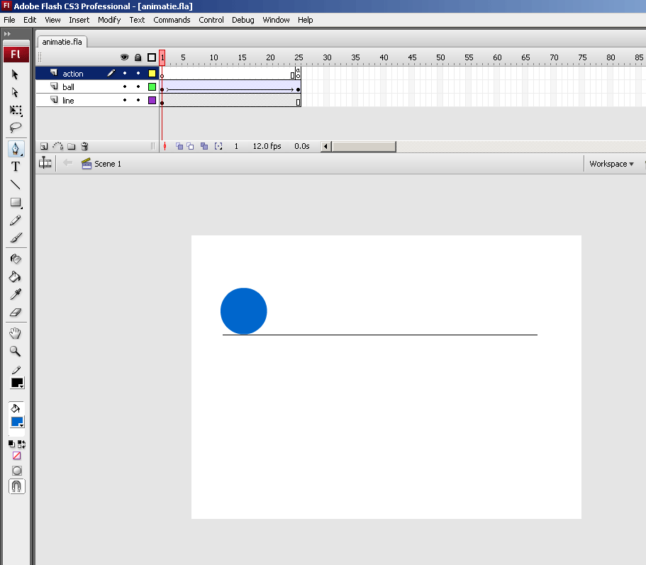 Bovenop het stage panel vind je de timeline. Hier componeer je je animaties. Veranderingen in de animatie geef je aan door middel van keyframes. Je kunt ook meerdere lagen gebruiken, om zo je animatie of interface te structureren en gelaagd op te bouwen. In bijgaand voorbeeld zie je 3 lagen onder elkaar: action, ball en line.