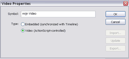 Kies voor ActionScript-controlled. Dit betekent dat je met actionscript de code gaat aansturen. Vervolgens sleep je het naar de Stage, geef je het een Instance Name (filmpje) en pas je de grote aan, aan de maat van je video. Nu zijn er nog drie dingen nodig om de video af te spelen;